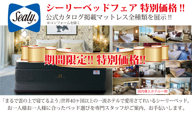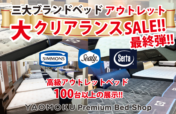 世界の一流ホテルでも採用されている3大ベッドブランド、シモンズ・シーリー・サータベッドのアウトレットショップ。