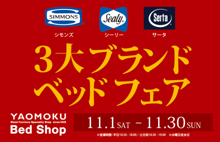 寝心地の違いを1店舗で体感できるYAOMOKU Bed Shopシモンズ・シーリー・サータベッド・アンネル・ドリーム・フランスベッド・パラマウントベッド他 国内最大級の展示数です READ MORE -